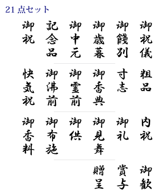 商品説明 のし袋用スタンプ 【表書き印21点+個人8点セット】 商品詳細 【表書き印21点セット】 ■印面内容 御祝/記念品/御中元/御歳暮/御餞別/御祝儀/ 快気祝/御沸前/御霊前/御香典/寸志/ 粗品/御香料/御布施/御供/御見舞/ 御礼/内祝/贈呈/賞与/御歓 ■サイズ 60mm×15mm 【個人8点セット】 ◆印面内容 1.金 2.参千円也 3.五千円也 4.壱萬円也 5.弐萬円也 6.参萬円也 7.お名前 8.ご住所 ◆サイズ スタンプ1 :10mm×10mm スタンプ2~6:34mm×8mm スタンプ7 :60mm×15mm スタンプ8 :60mm×10mm ※ご注意※ スタンプ8はご住所の長さにより2行表記になる場合がございます。