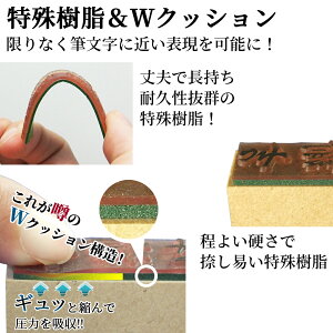 一般的に使用されるゴム印よりかすれ・滲みが少なく摩耗にも大変強く、繰り返し使用する印面としては最高峰の素材です! また、特殊樹脂と台木の間にクッションを合わせることにより捺印性能が格段に向上しました! 文字も然り、カタチにも工夫が織り込まれたゴム印です。